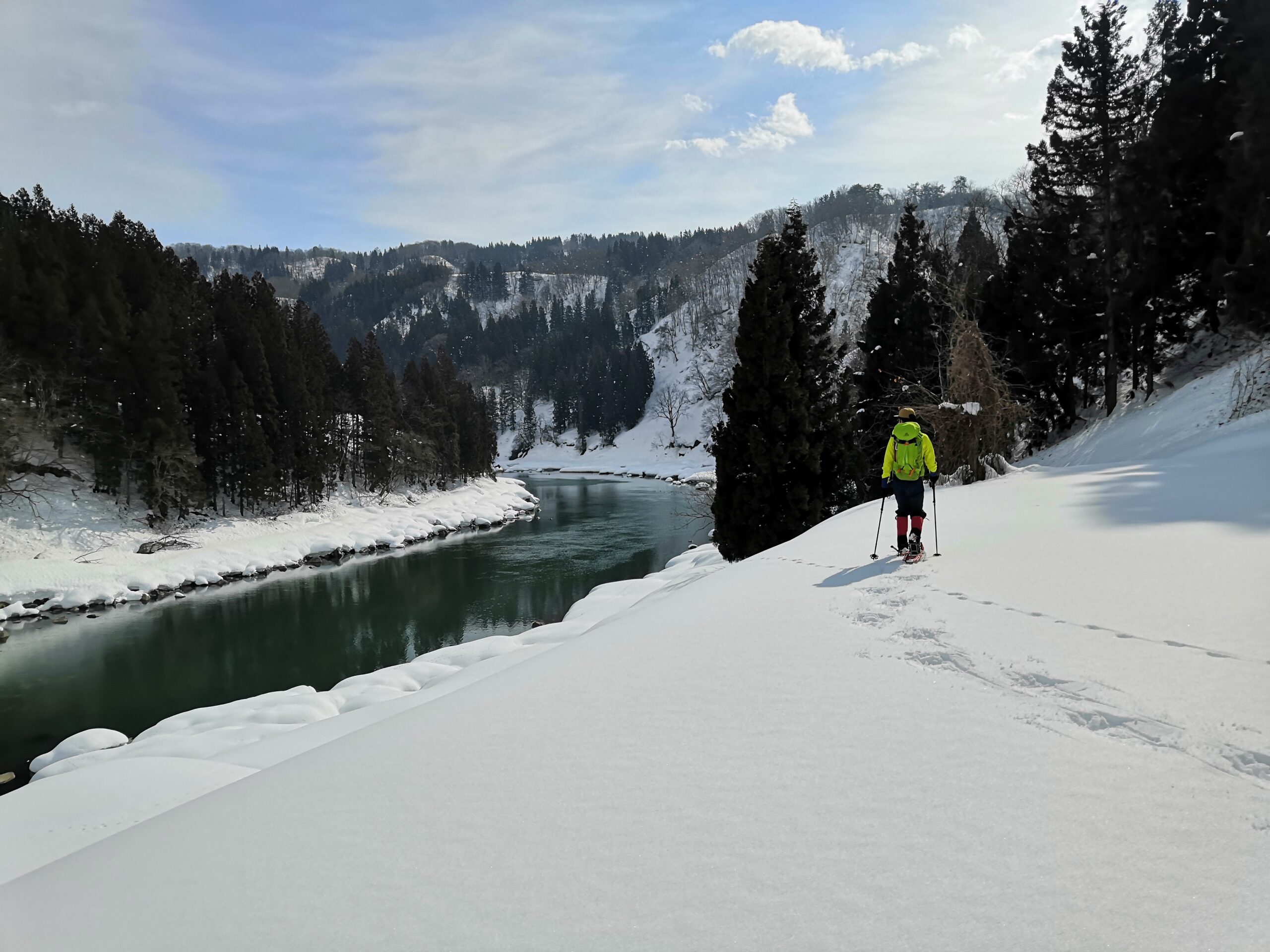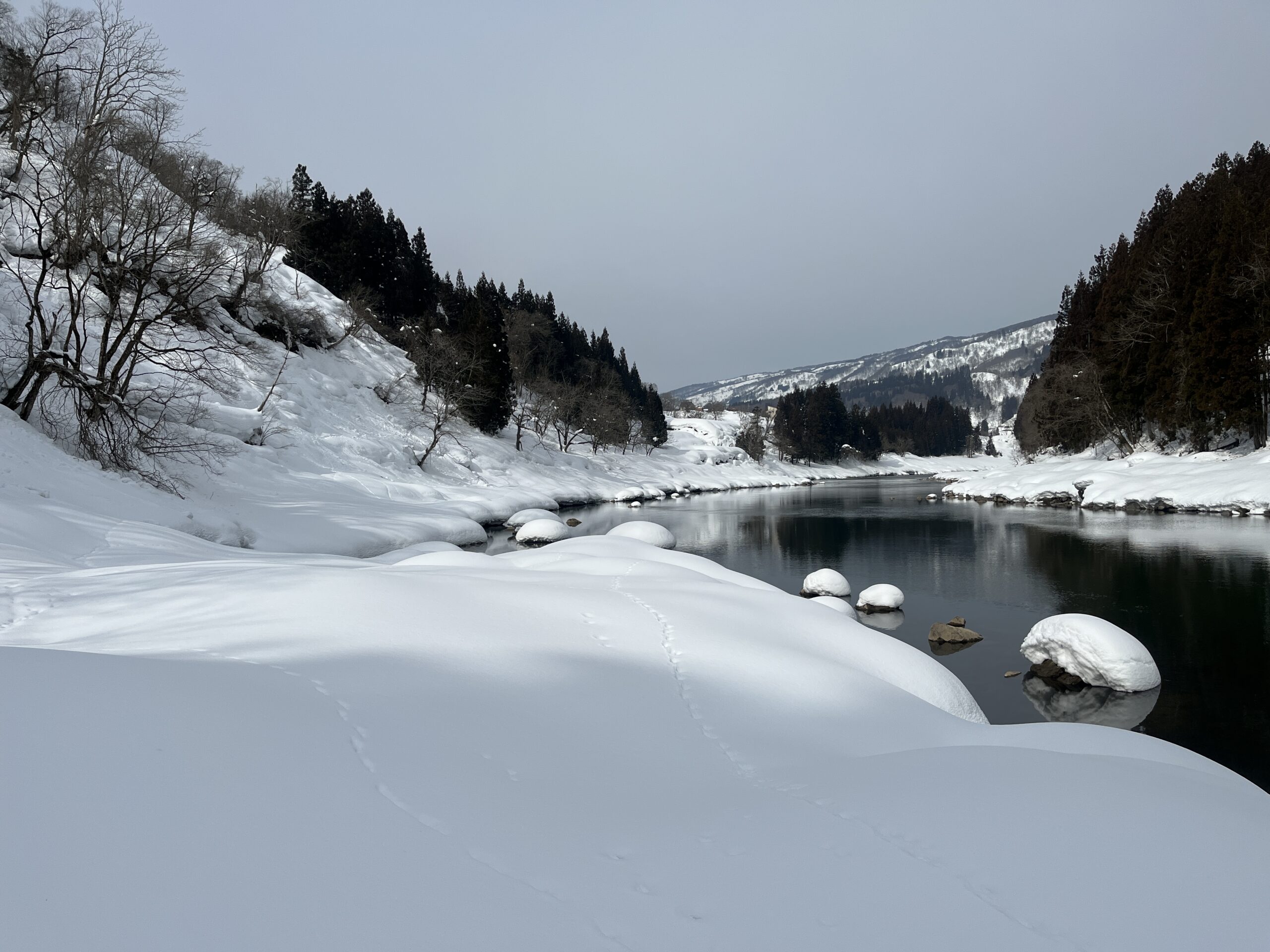 2日目はスノーシューハイクです。限られた時間の中で地形図を読みゴールを目指す、リーダーシップ養成とチームビルディングを狙いとした研修です。序盤は集落を歩いたり、田んぼの上を通ったり、千曲川の流れを見たりと景色を楽しみながら進みました。春~夏~秋にも同様の研修ができますが、夏シーズンでは歩けない場所にも積雪のおかげで踏み入ることができます。