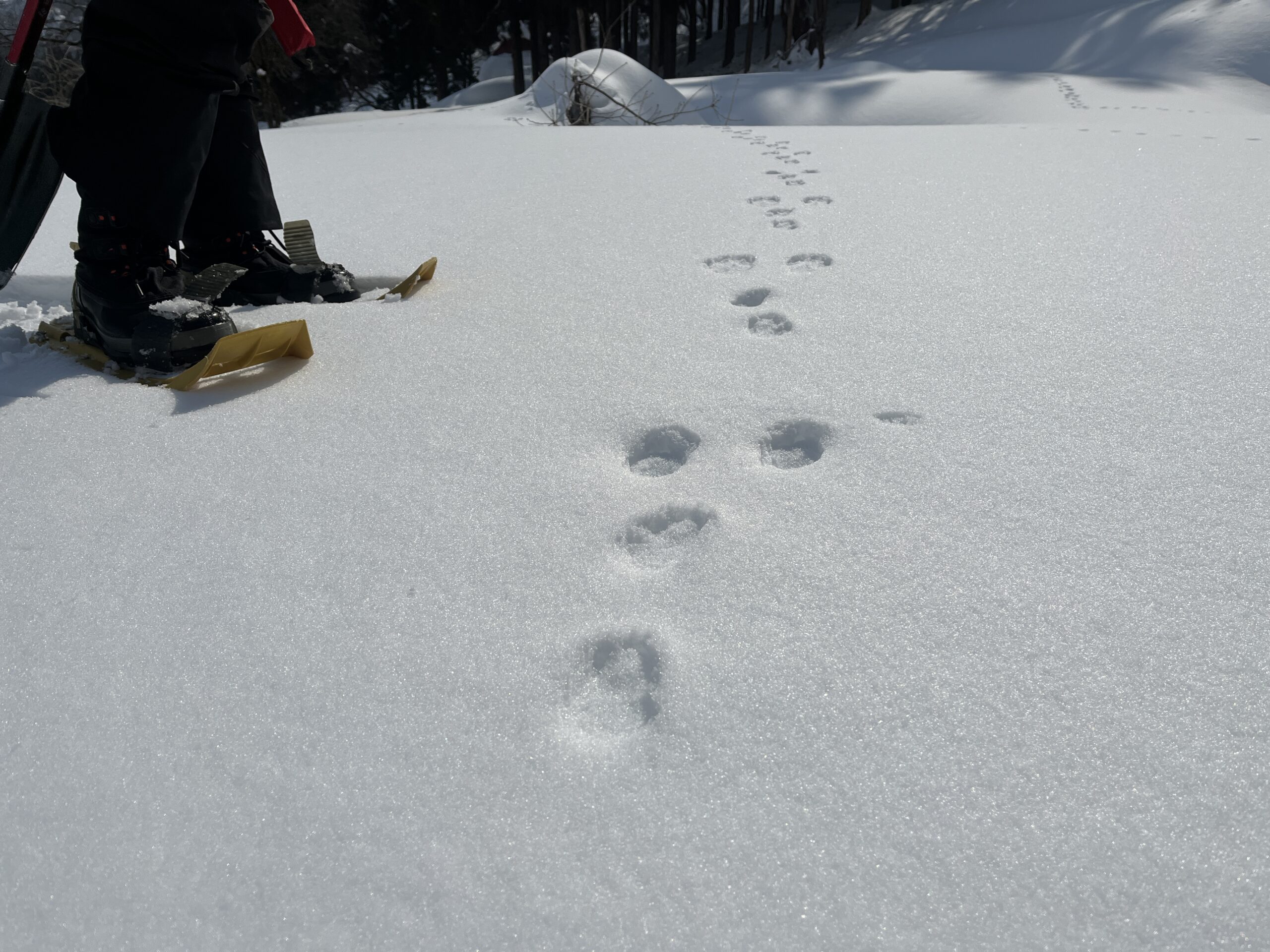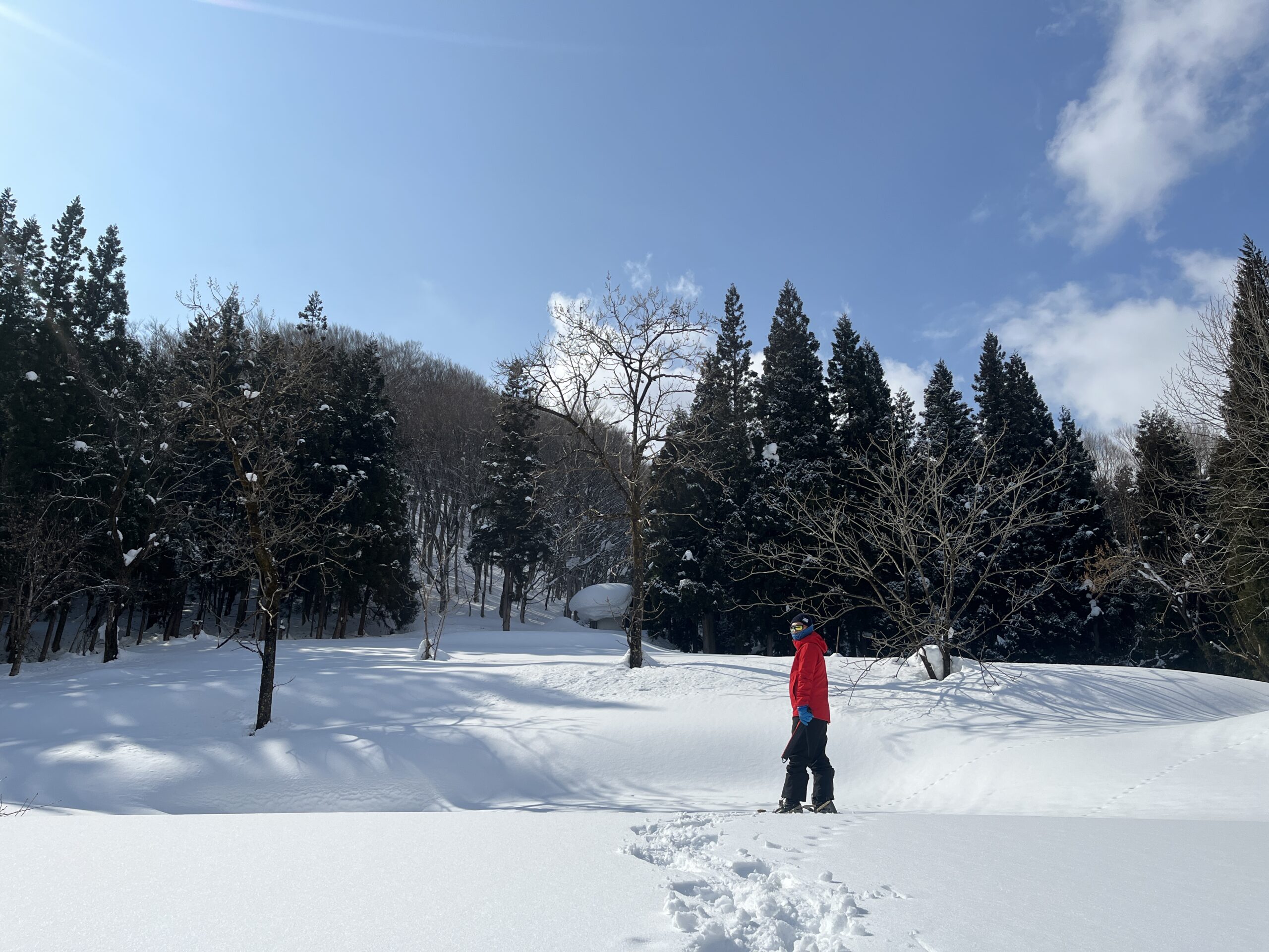 まずは準備運動です。雪洞を設営するエリアをスノーシューで散策しました。