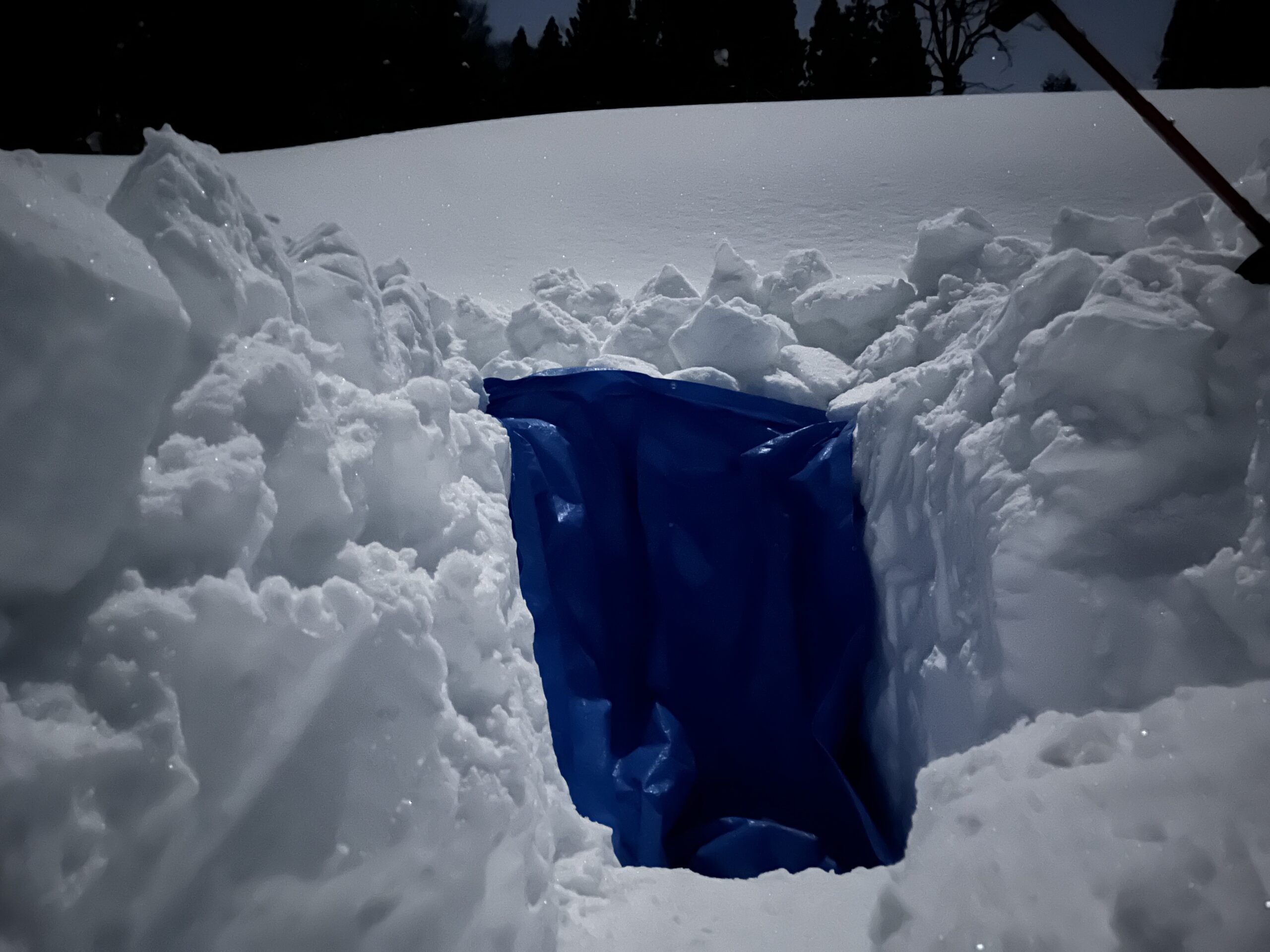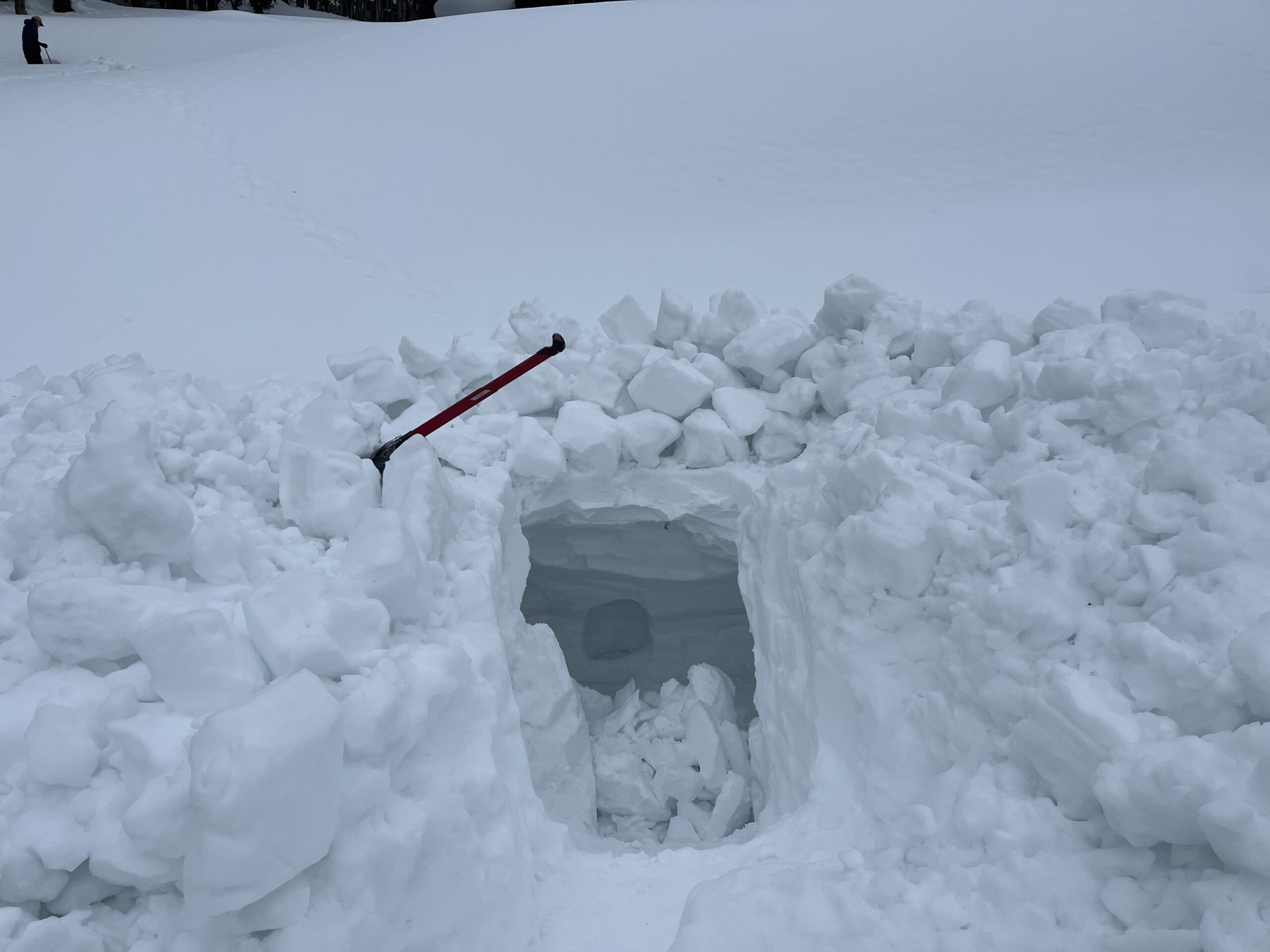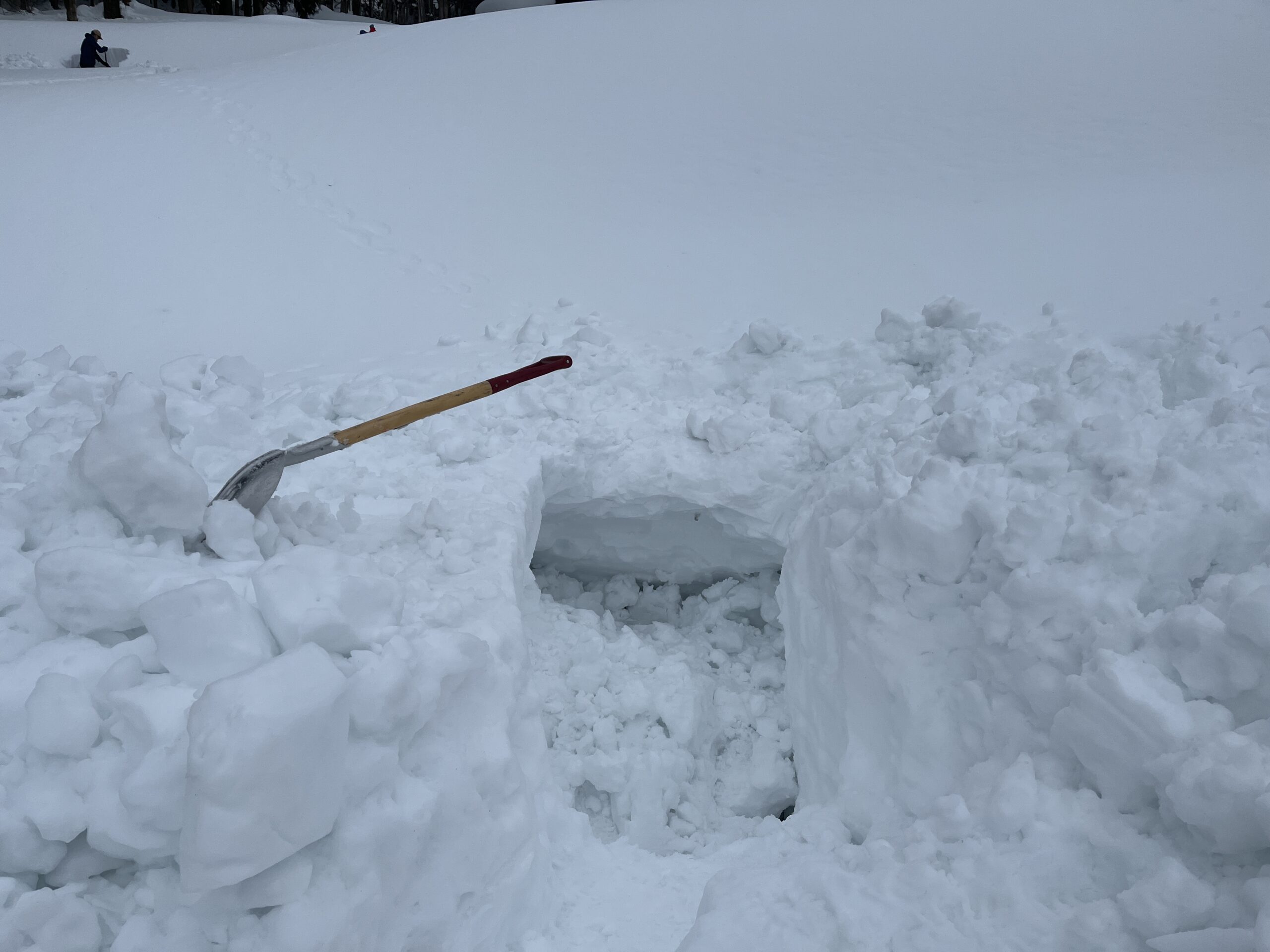 2日間のプログラムの最後には自分で作った雪洞を崩し、可能な限り埋め戻します。次にこのエリアを訪れる人の安全のためです。我ながらよく作ったと思う大きめサイズだったので、崩すのが大変でした。作るのに3時間以上かけましたが、崩すときはものの10分です。