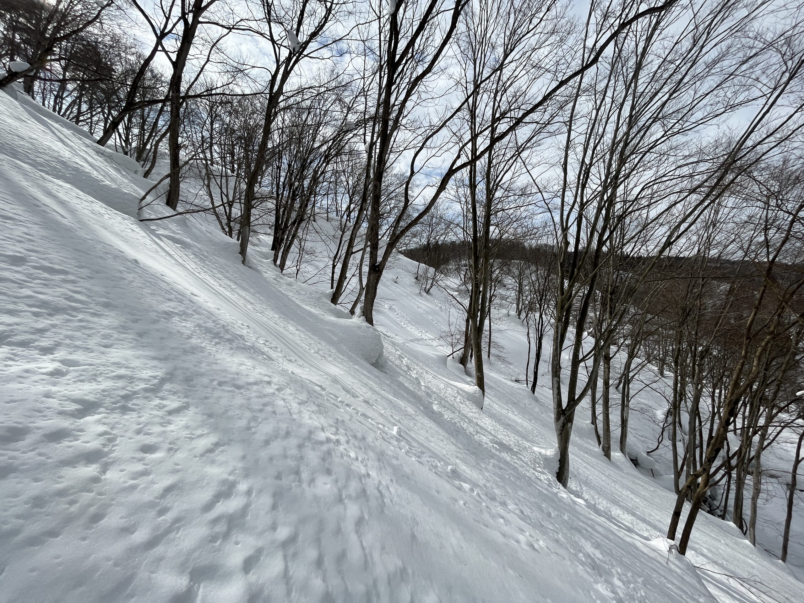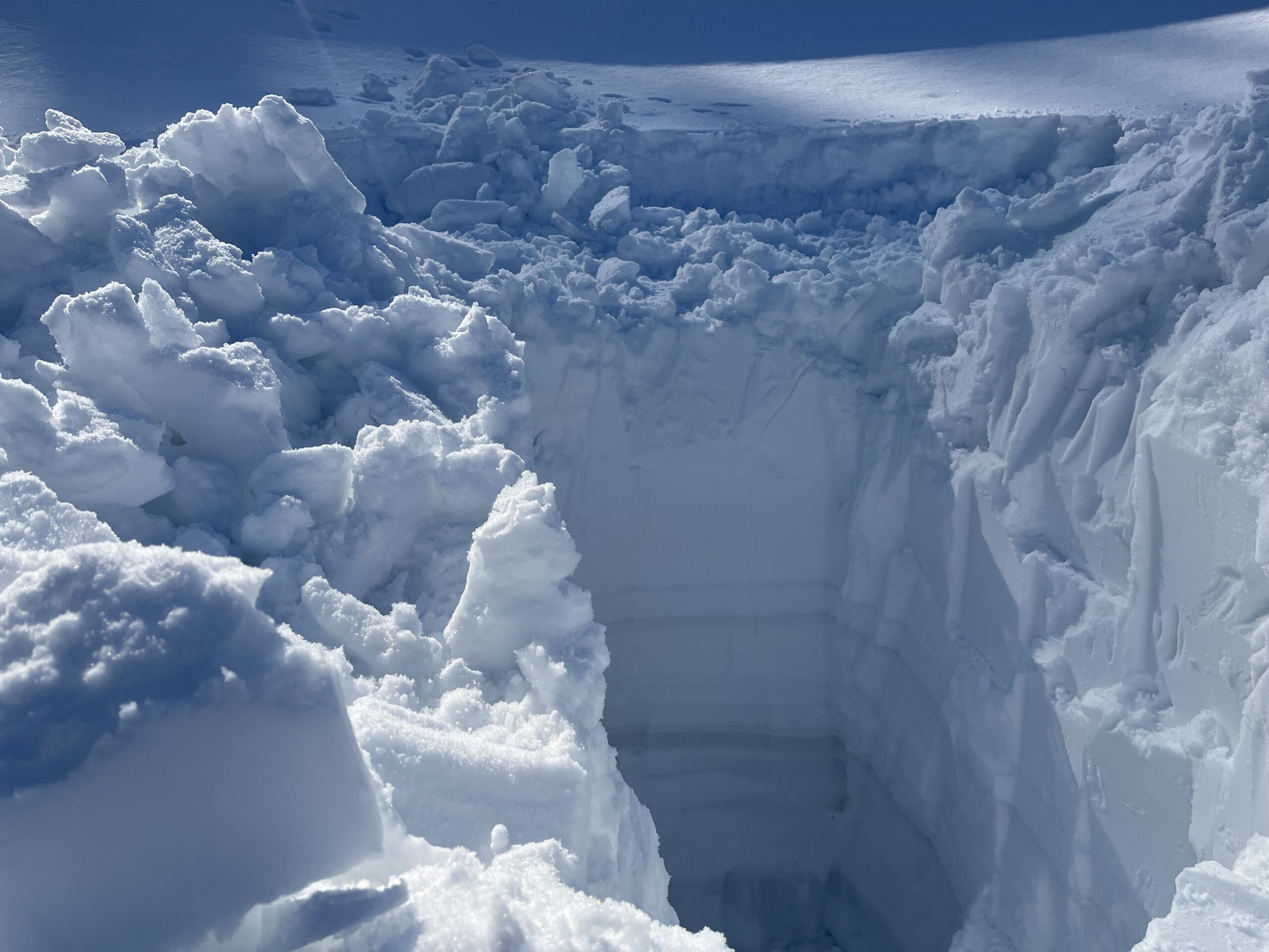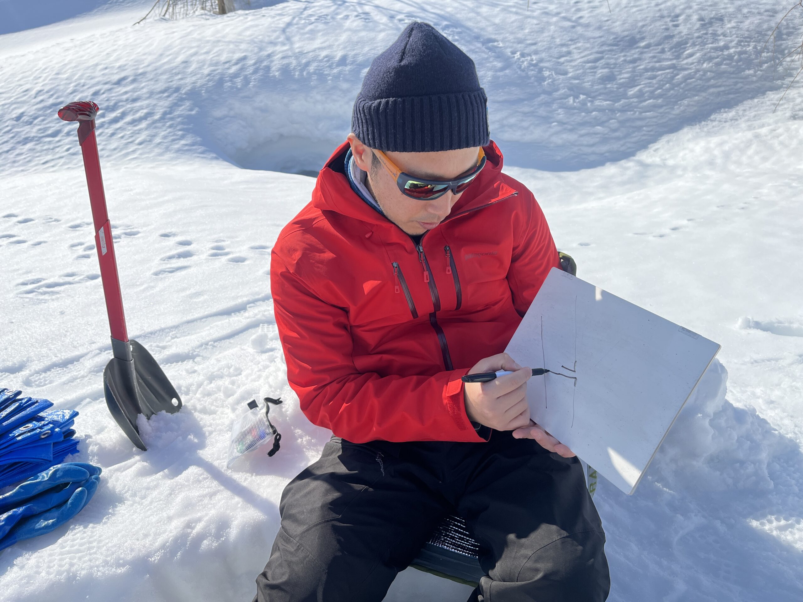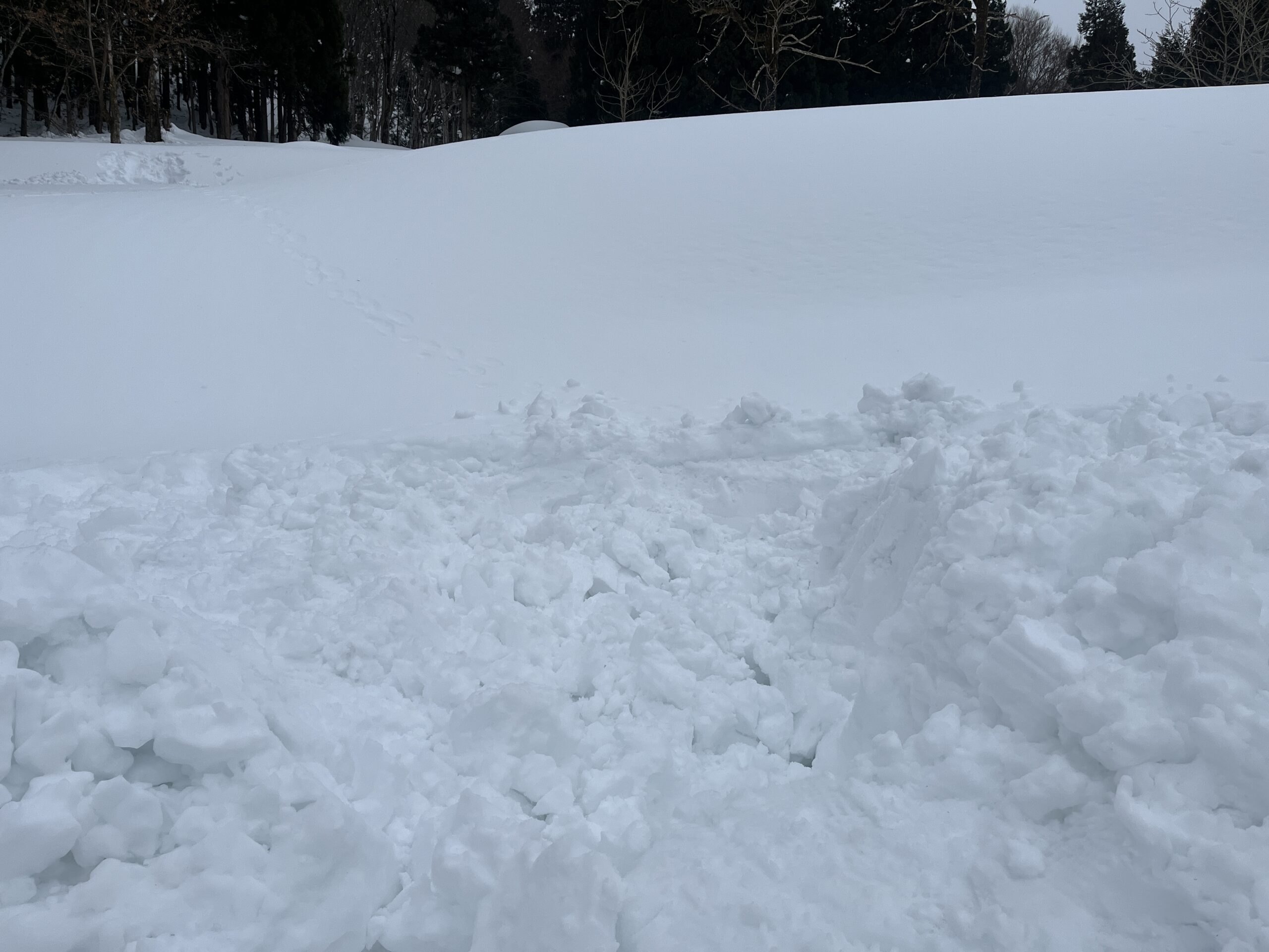 2日間のプログラムの最後には自分で作った雪洞を崩し、可能な限り埋め戻します。次にこのエリアを訪れる人の安全のためです。我ながらよく作ったと思う大きめサイズだったので、崩すのが大変でした。作るのに3時間以上かけましたが、崩すときはものの10分です。