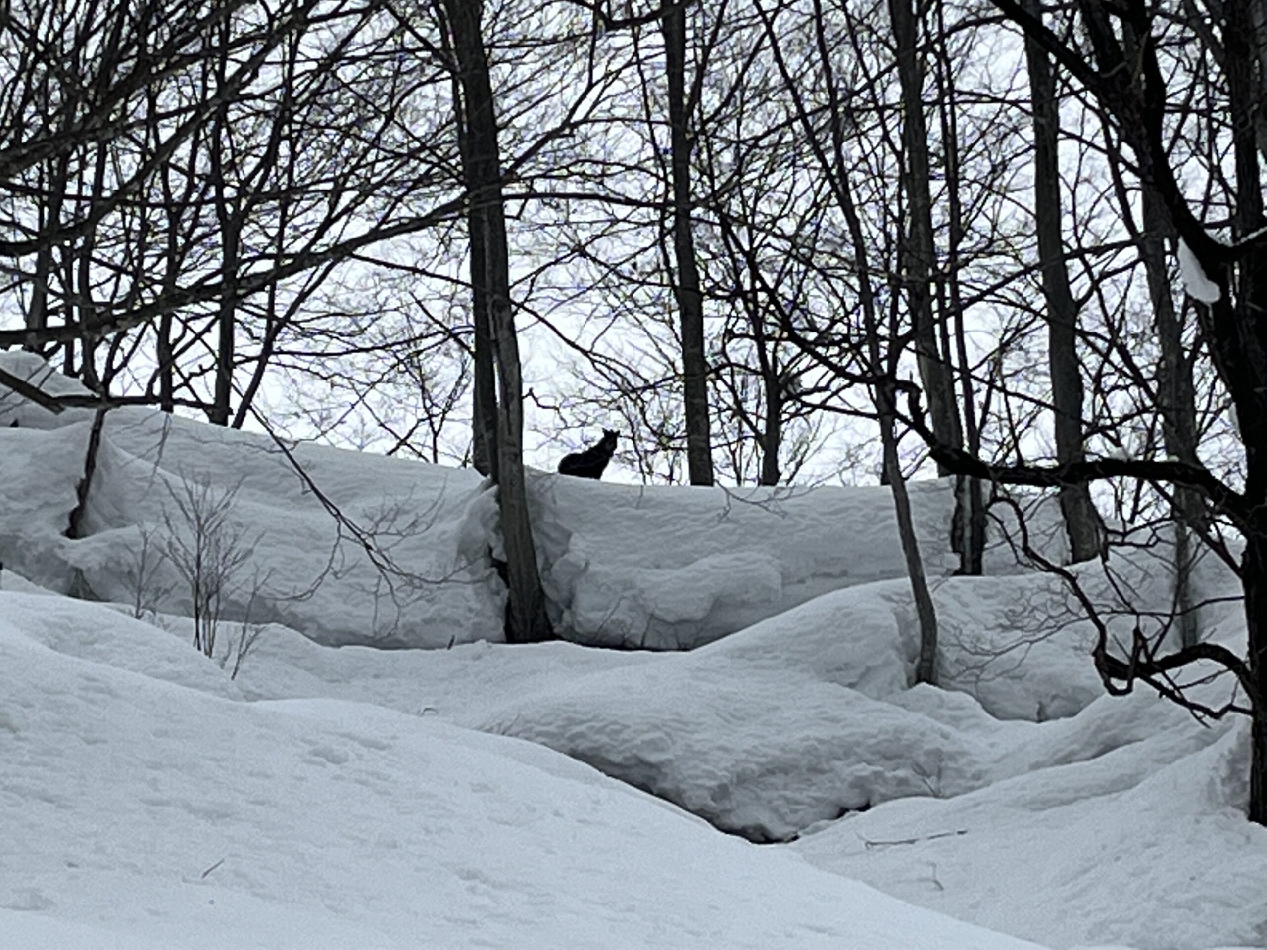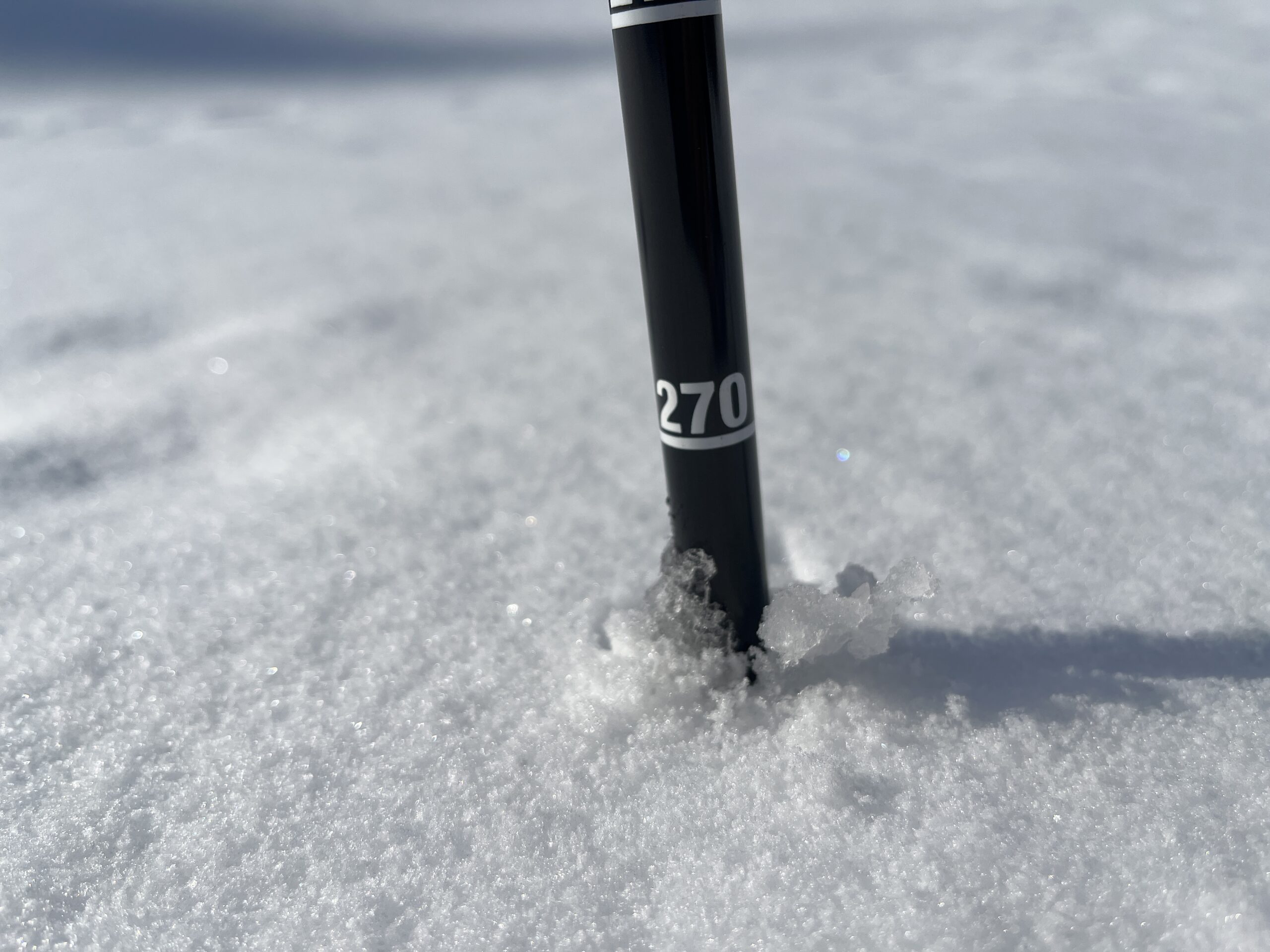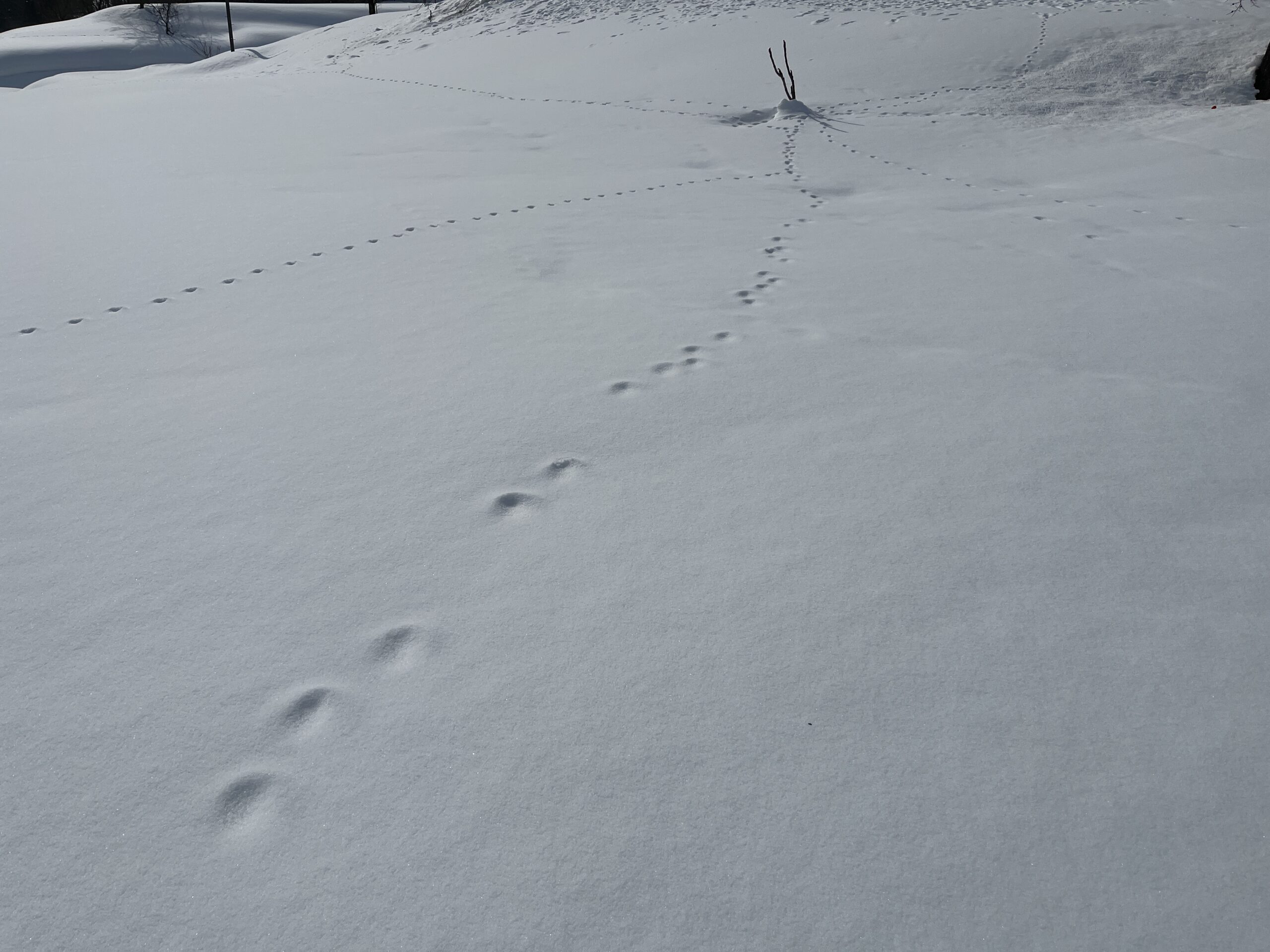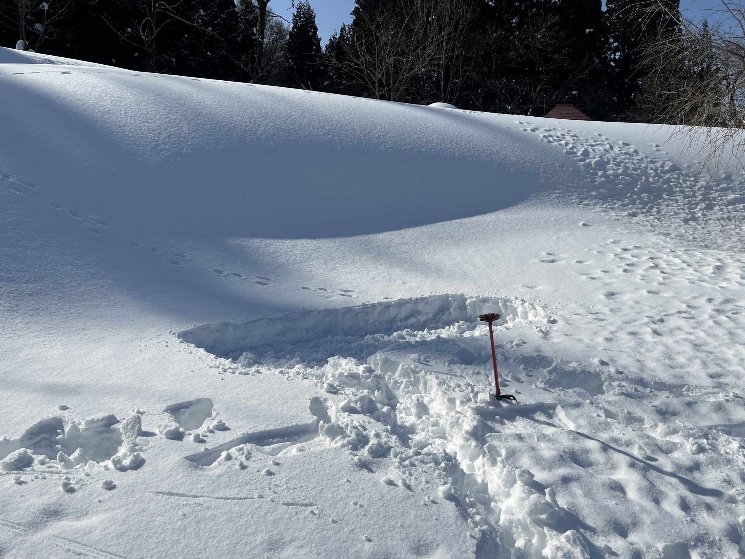 真ん中の写真は動物の足跡です。知っている人はひと目で分かりますね。いたるところに足跡があり、それだけでワクワクしてきます。ゾンデ棒*で測ってみたところ、積雪は270㎝。ずっと下に地面があることが想像できません。