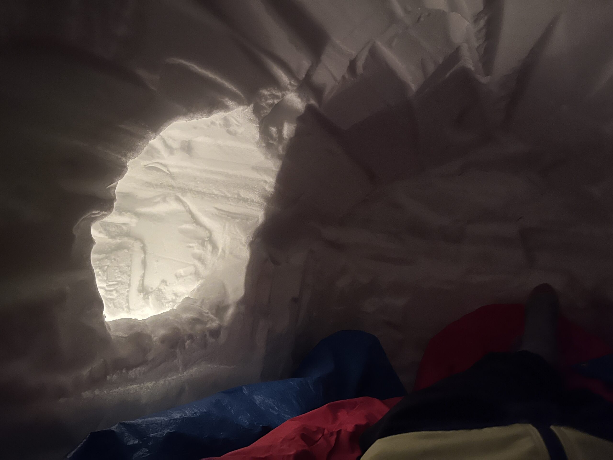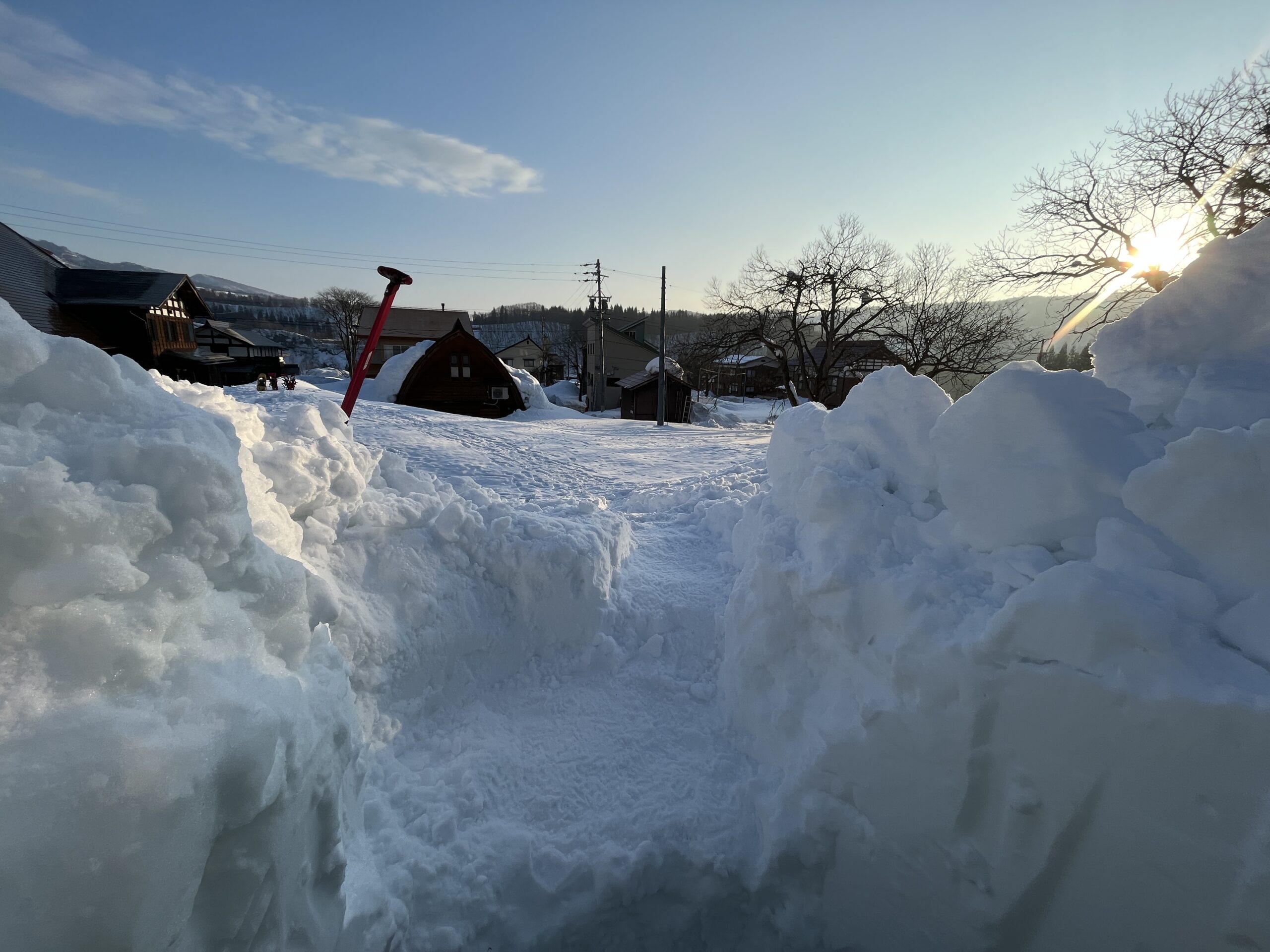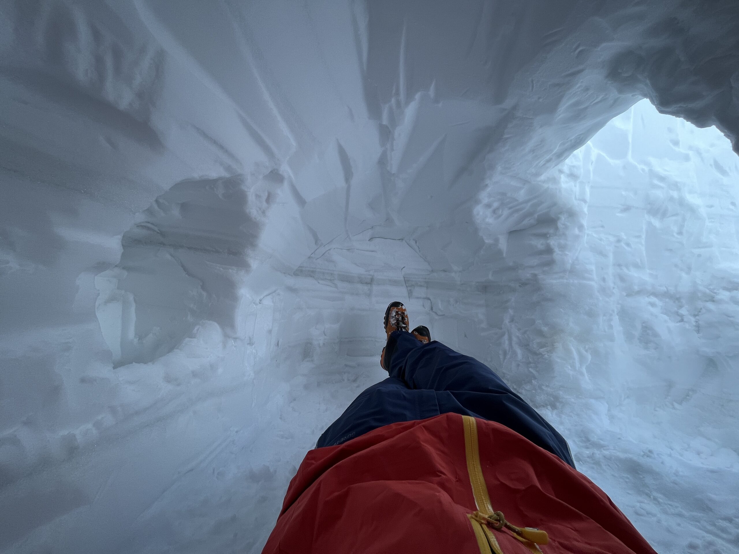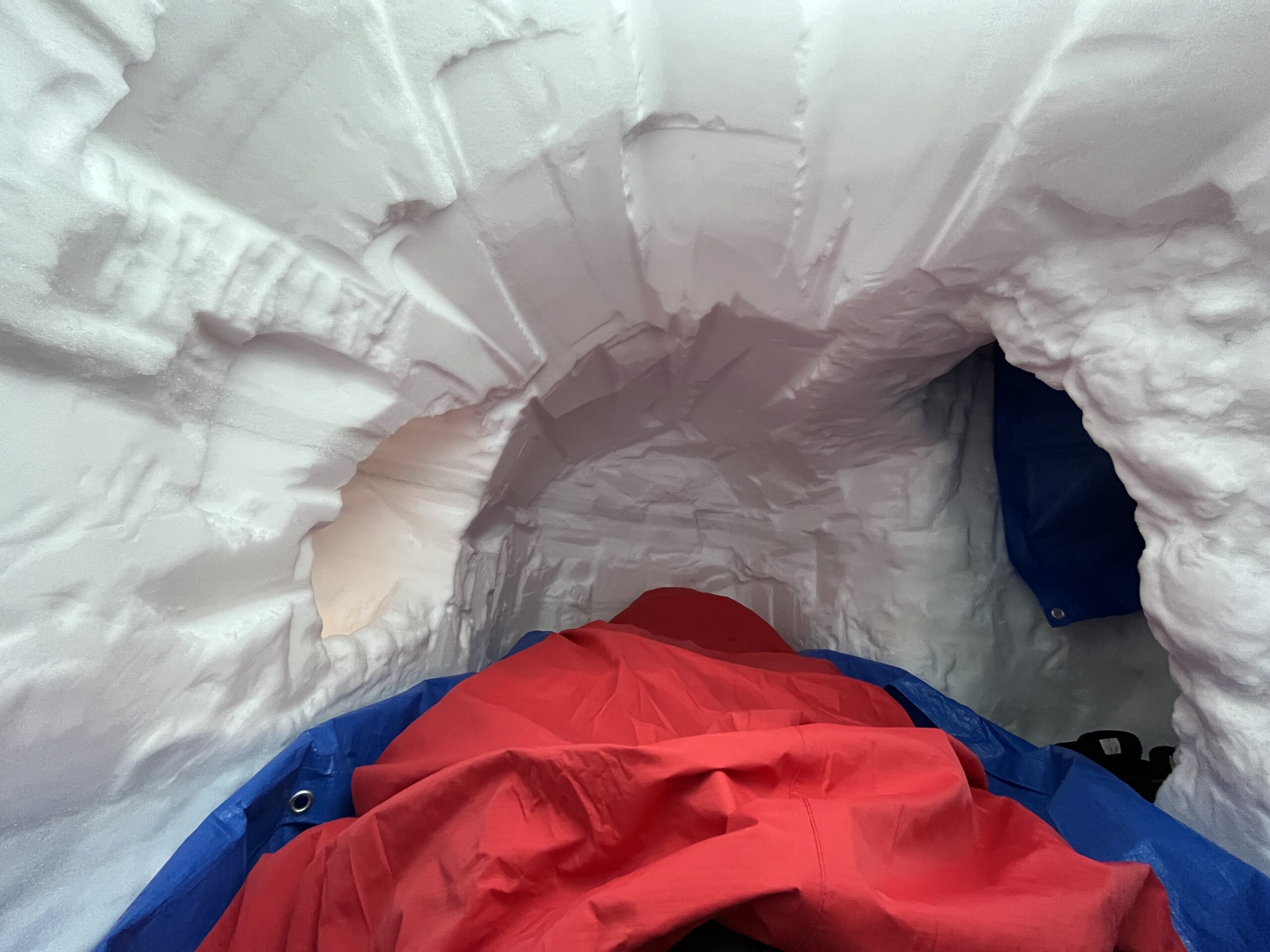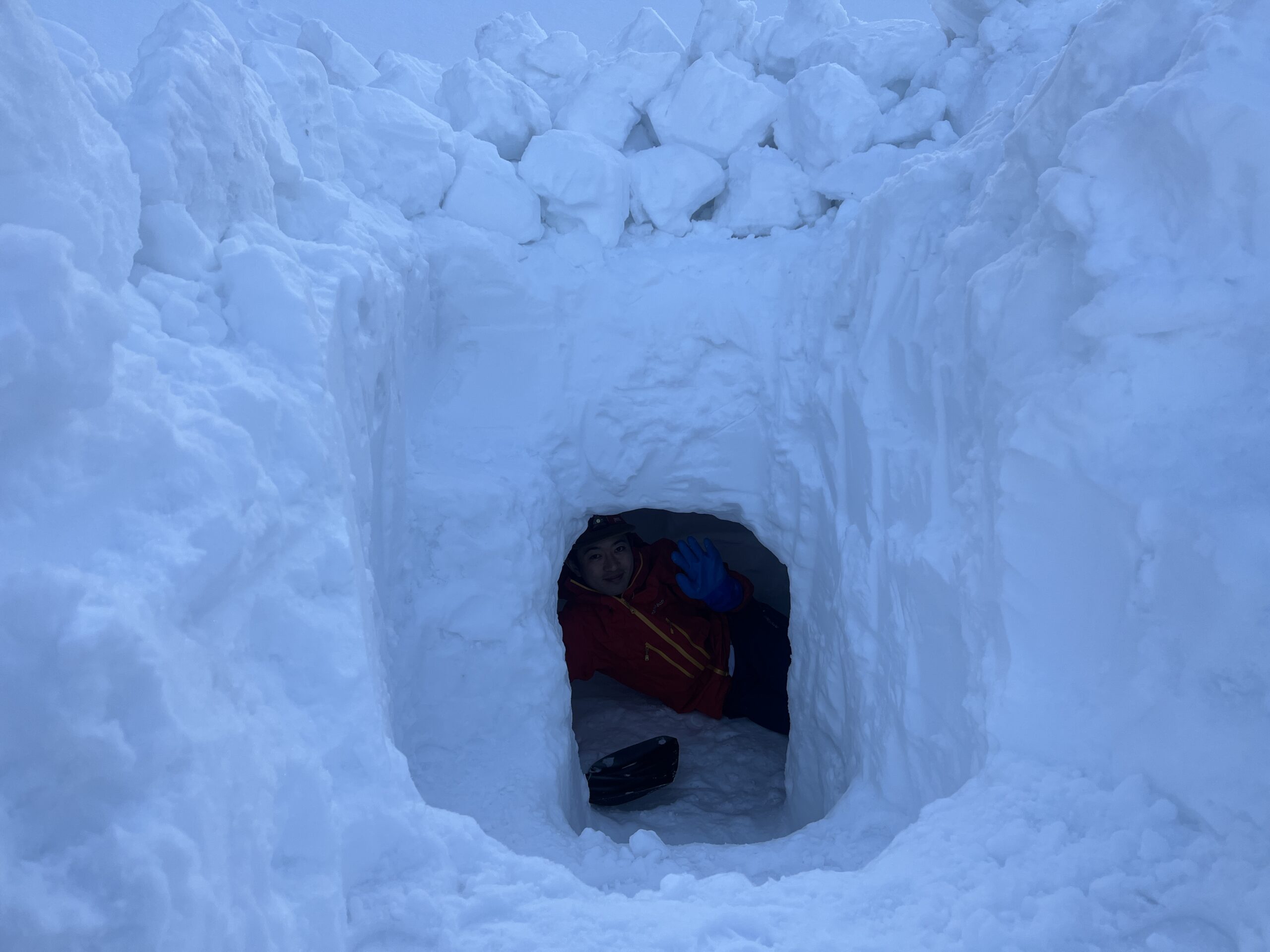 雪を掘るのは楽しいですが、途中で雪の排出作業が少し面倒に感じます。ただそれを乗り越えないと自分の家は完成しません。忍耐と集中の時間です。完成を目指して堀り続けます。大体の大きさになったら、雪洞に出入りする動きをしたり横になるなど、実際の使用シーンを想定して細かな部分に取り掛かります。