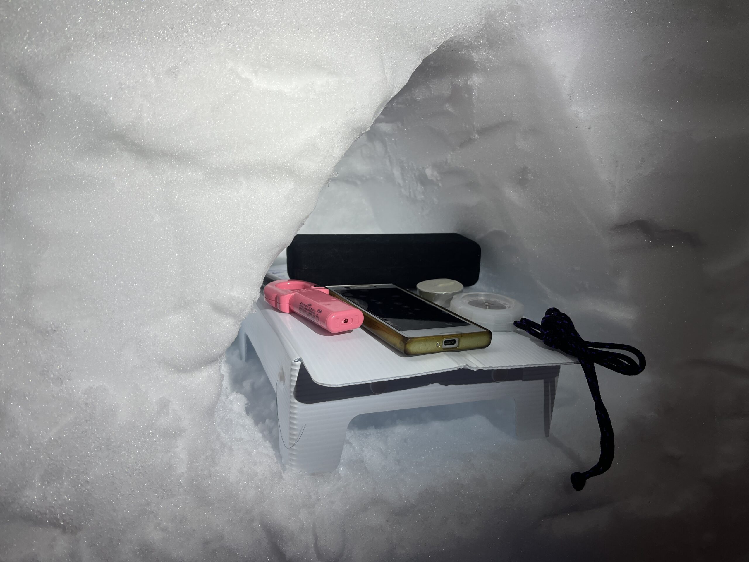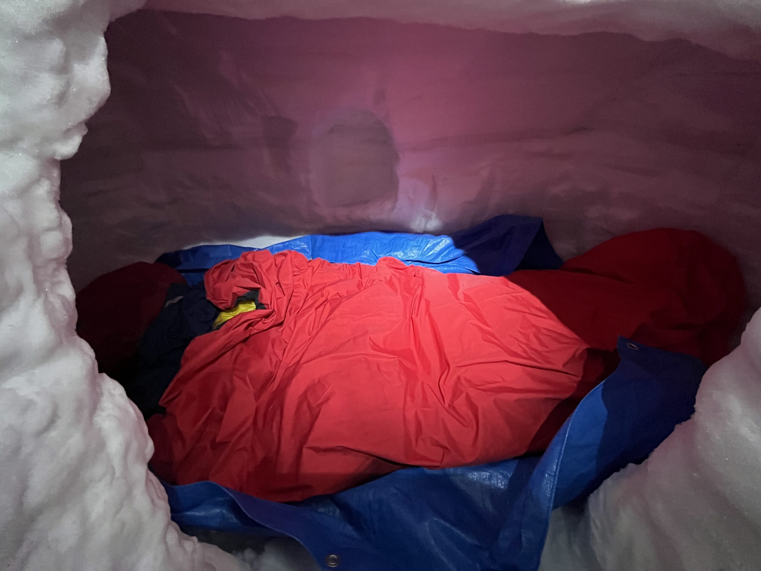 いよいよ雪の中で一晩を過ごします。外気温はマイナス3~5℃としっかり冷え込んでいますが、雪洞内は0℃~マイナス2℃です。マットを数枚重ね、冬仕様の寝袋を準備。万全の装備ですが、本当に雪の中でひと晩を過ごせるか、一抹の不安は消えません。